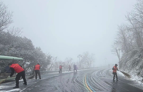 一场不期而至的瑞雪悄然降临茅山,雪后茅山银装素裹,宛如仙境,然而积雪也给游客游览带来了不便。景区志愿者们迅速行动,拿起扫帚、铁锹等工具,清扫主干道路面上的积雪。他们不畏严寒、分工明确、干劲十足,有的负责清扫主干道,有的专注于清理台阶上的积雪。在大家共同努力下积雪清除,为游客开辟出安全的旅游通道。