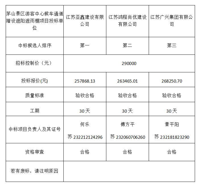 句容市茅山创业旅游有限公司 的茅山景区游客中心候车通道增设遮阳遮雨棚项目于2023年7月27日09时00分依法开标后,评标委员会按照招标文件规定的评标标准和方法进行评审(本工程采用综合评分法进行评标定标,评分排名第一的为中标单位),根据评标委员会提出书面报告和推荐的中标候选人,现将评标结果、中标候选人和评委评标的情况公示如下: