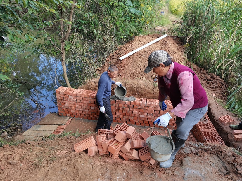 民有所呼,我有所应。周家岗村委会了解情况后,立刻组织人员赶赴现场对坍塌路段全面勘察,同步开展潜在安全风险评估,并迅速制定抢修方案。修缮现场,施工人员采用人工协作方式,有序开展清淤疏浚、垒筑干砌,水泥固壁等作业,同时对破损松动路面进行分层夯实填充、压实及整平。经过4天的高效施工,沉降塌陷水渠及配套路面全部修复完成,道路恢复平整畅通。