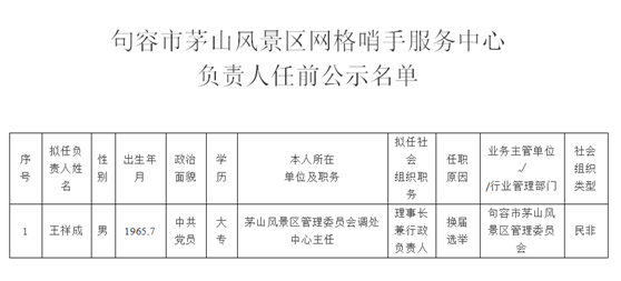 为进一步加强对社会组织负责人任职监督,充分发挥社会组织服务国家、服务社会、服务群众、服务行业的作用,按照社会组织相关条例以及中共中央办公厅、国务院办公厅《关于改革社会组织管理制度促进社会组织健康有序发展的意见》有关规定,根据句容市茅山风景区网格哨手服务中心申报,经审查,现将拟任句容市茅山风景区网格哨手服务中心负责人予以公示。
