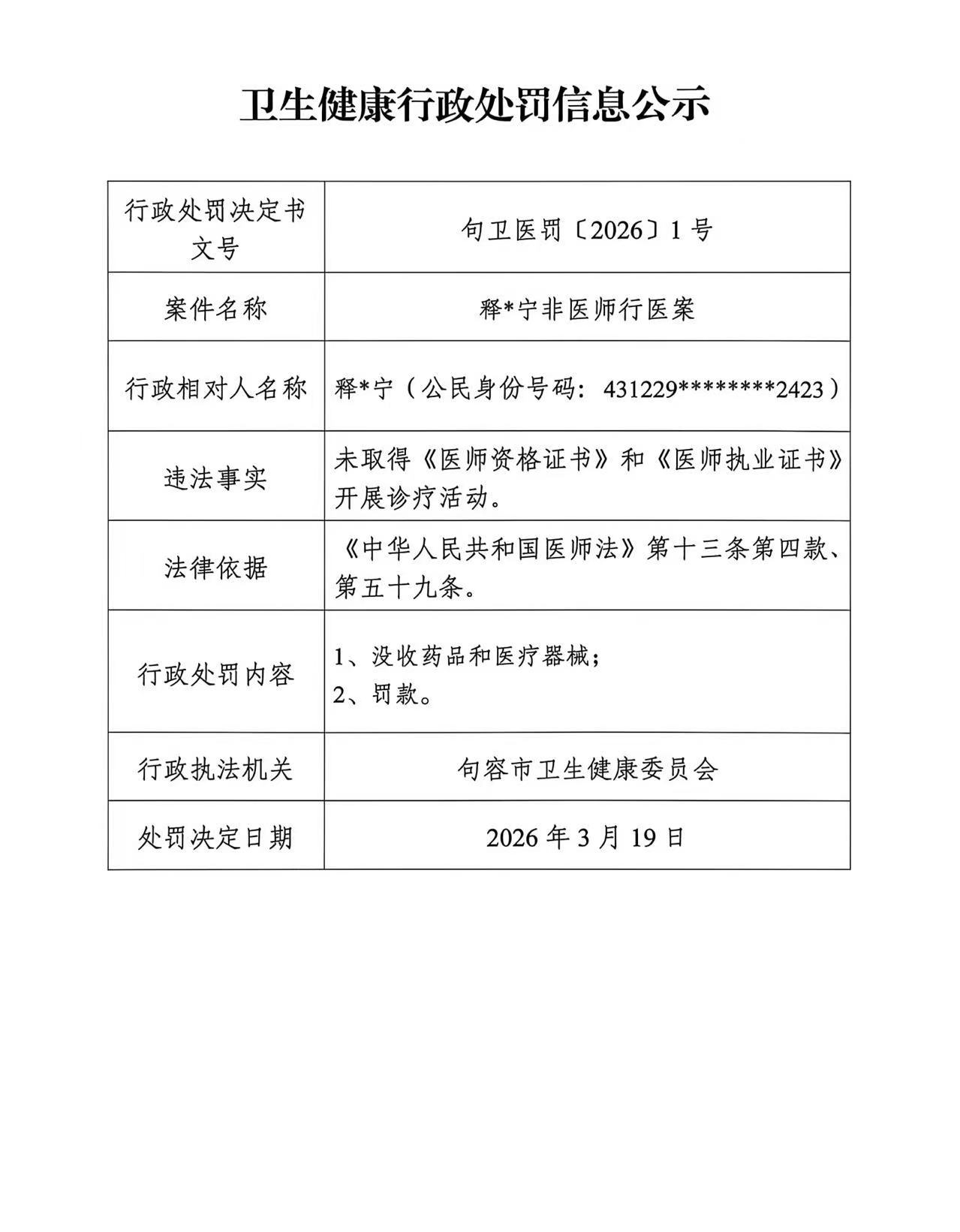 卫生健康行政处罚信息公示