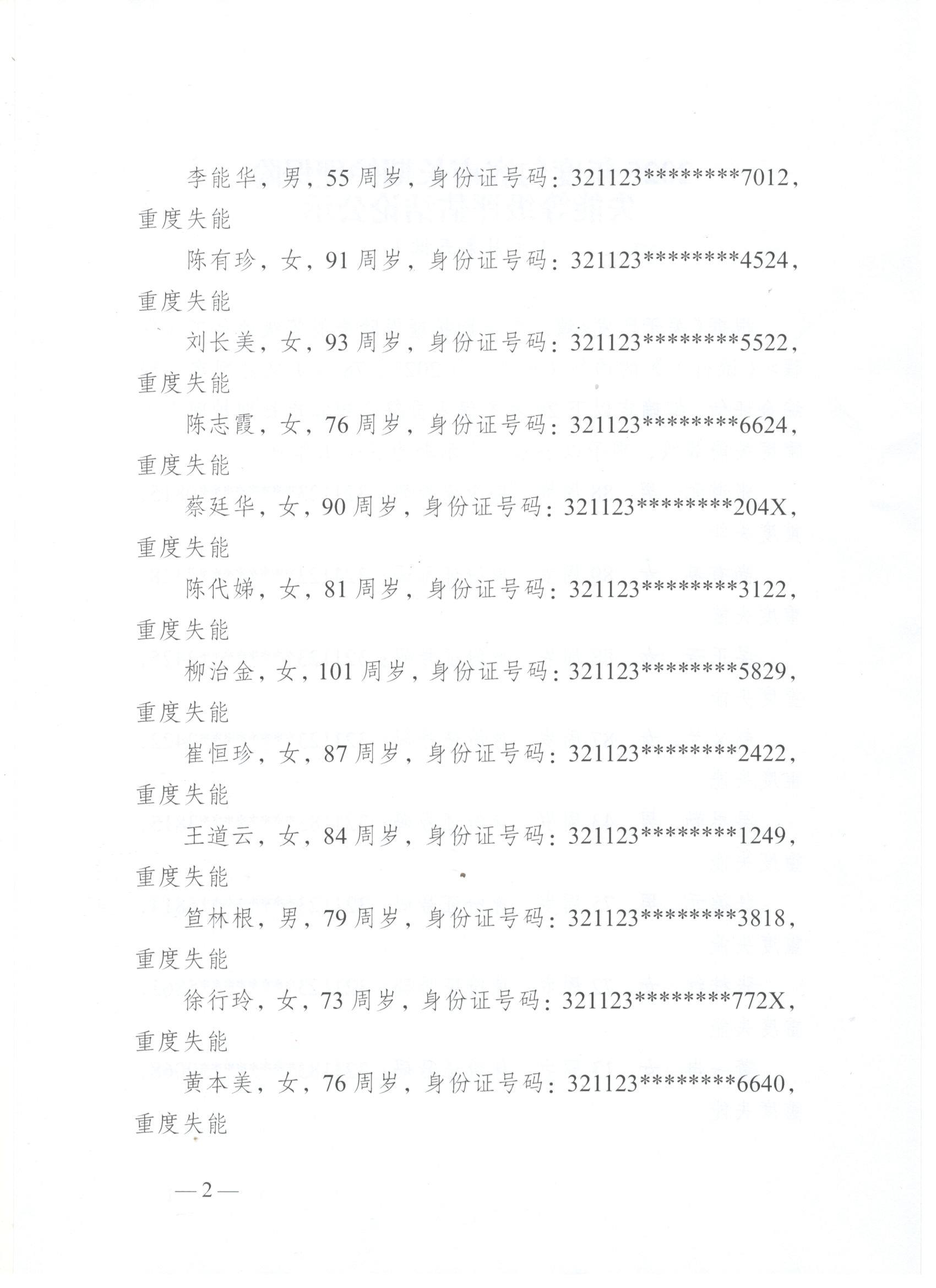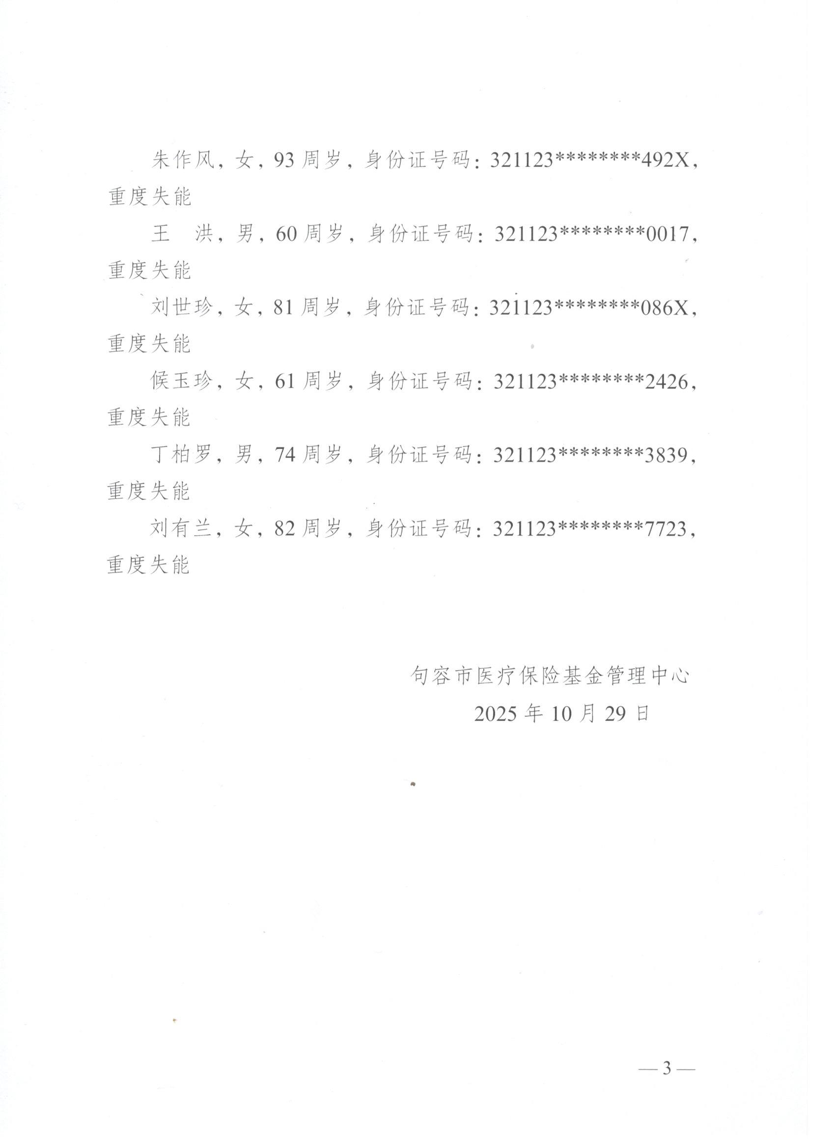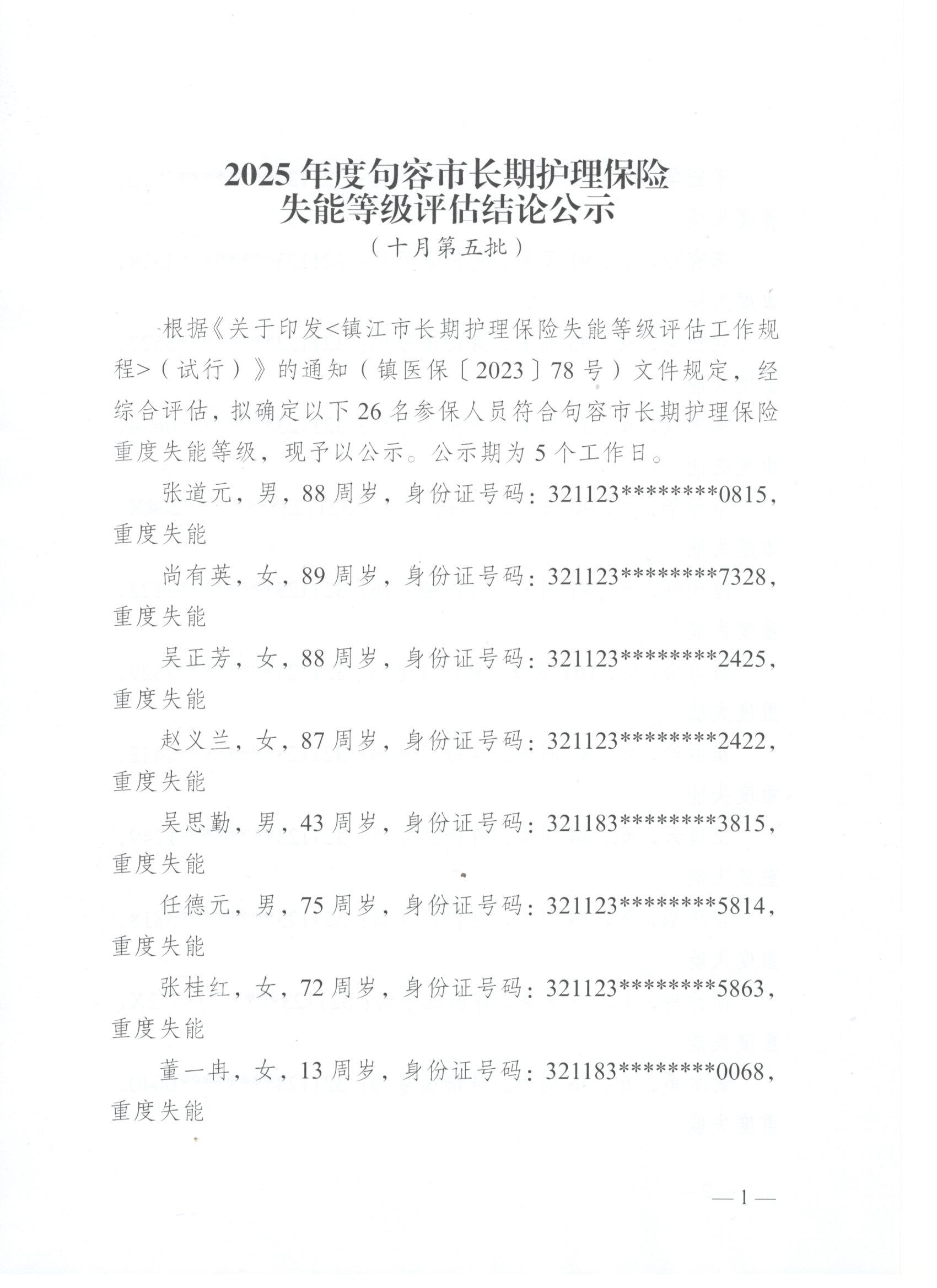 2025年度句容市长期护理保险失能等级评估结论公示(10月第五批)