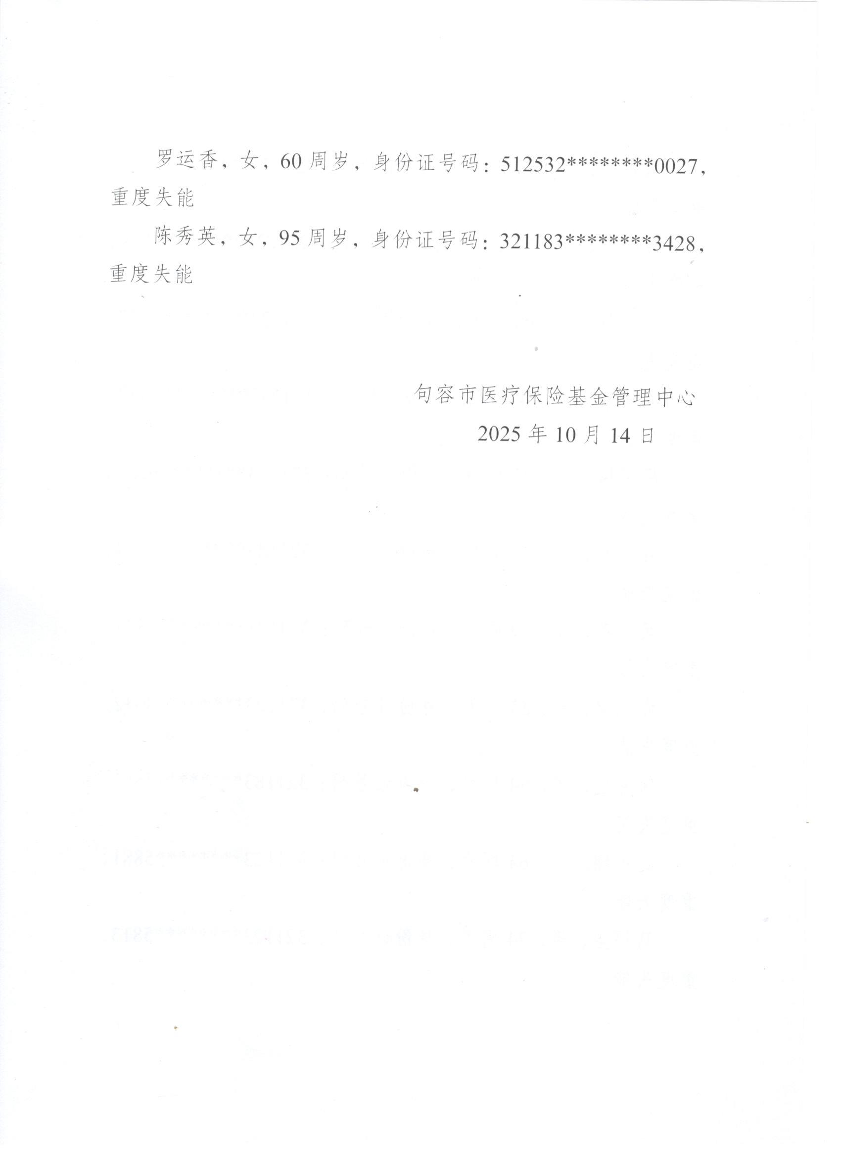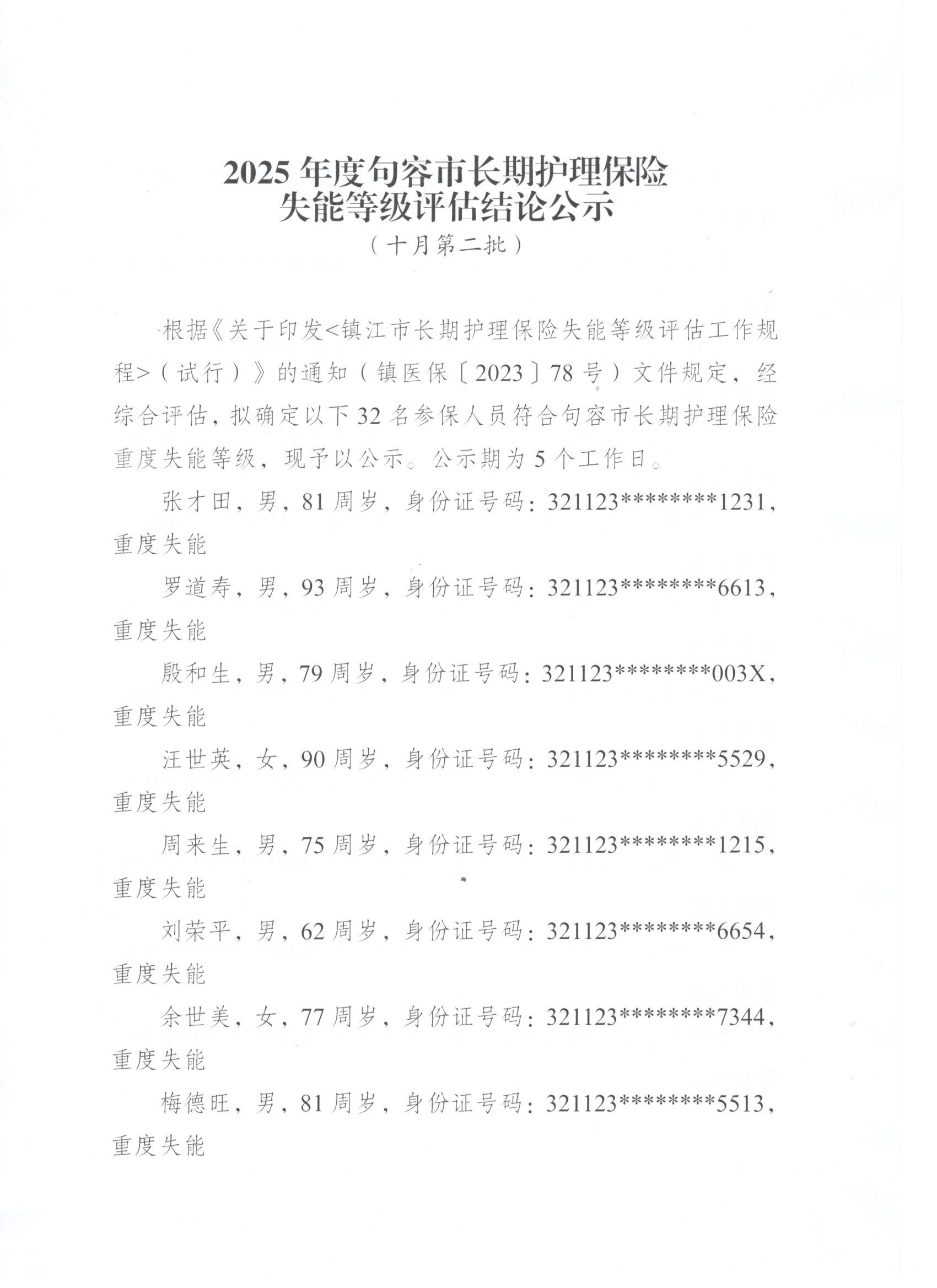 2025年度句容市长期护理保险失能等级评估结论公示(10月第二批)