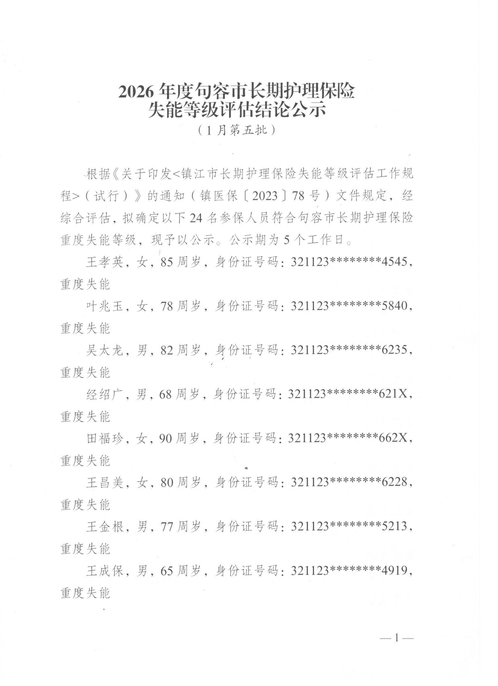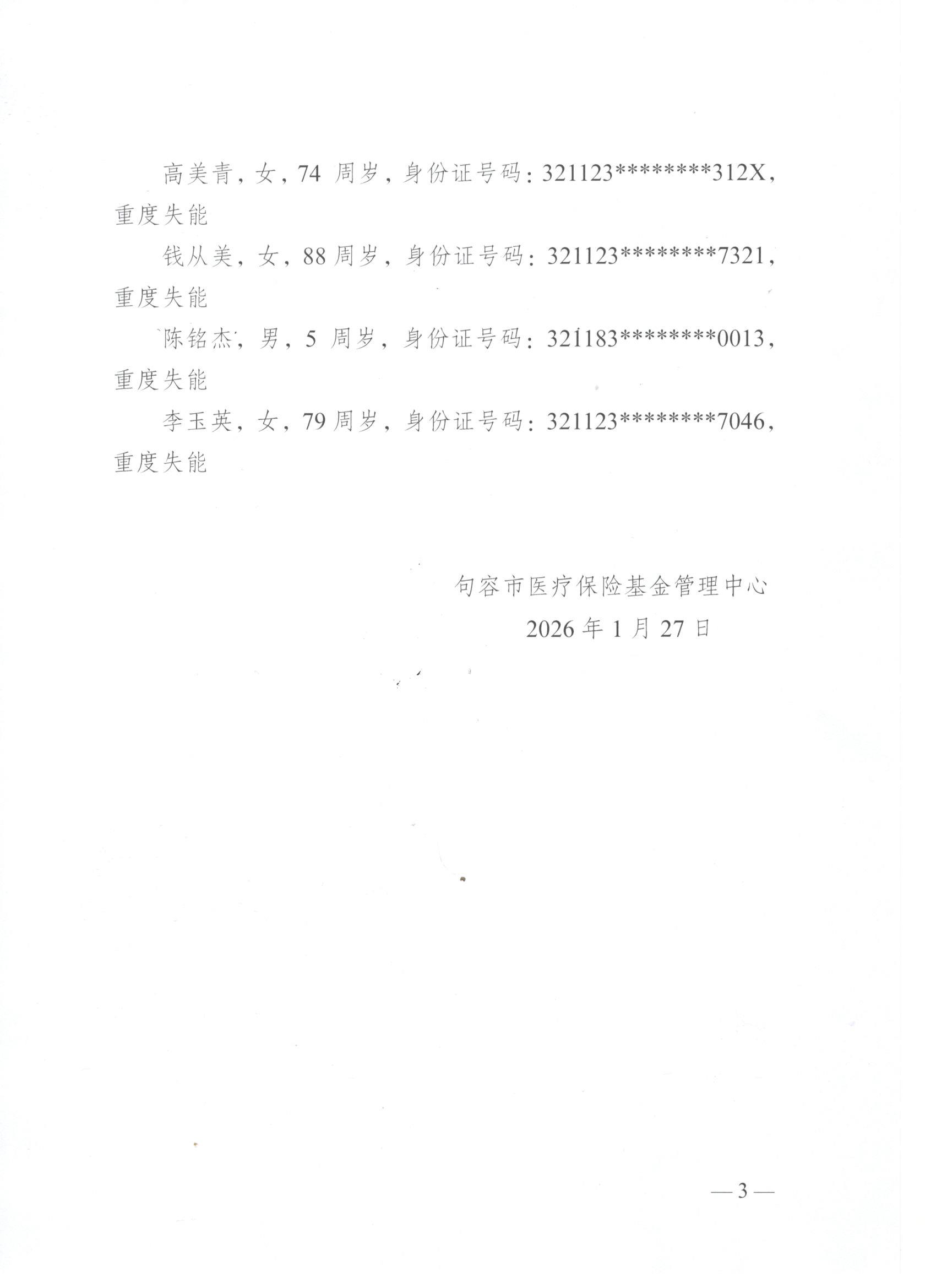 2026年度句容市长期护理保险失能等级评估结论公示(1月第五批)