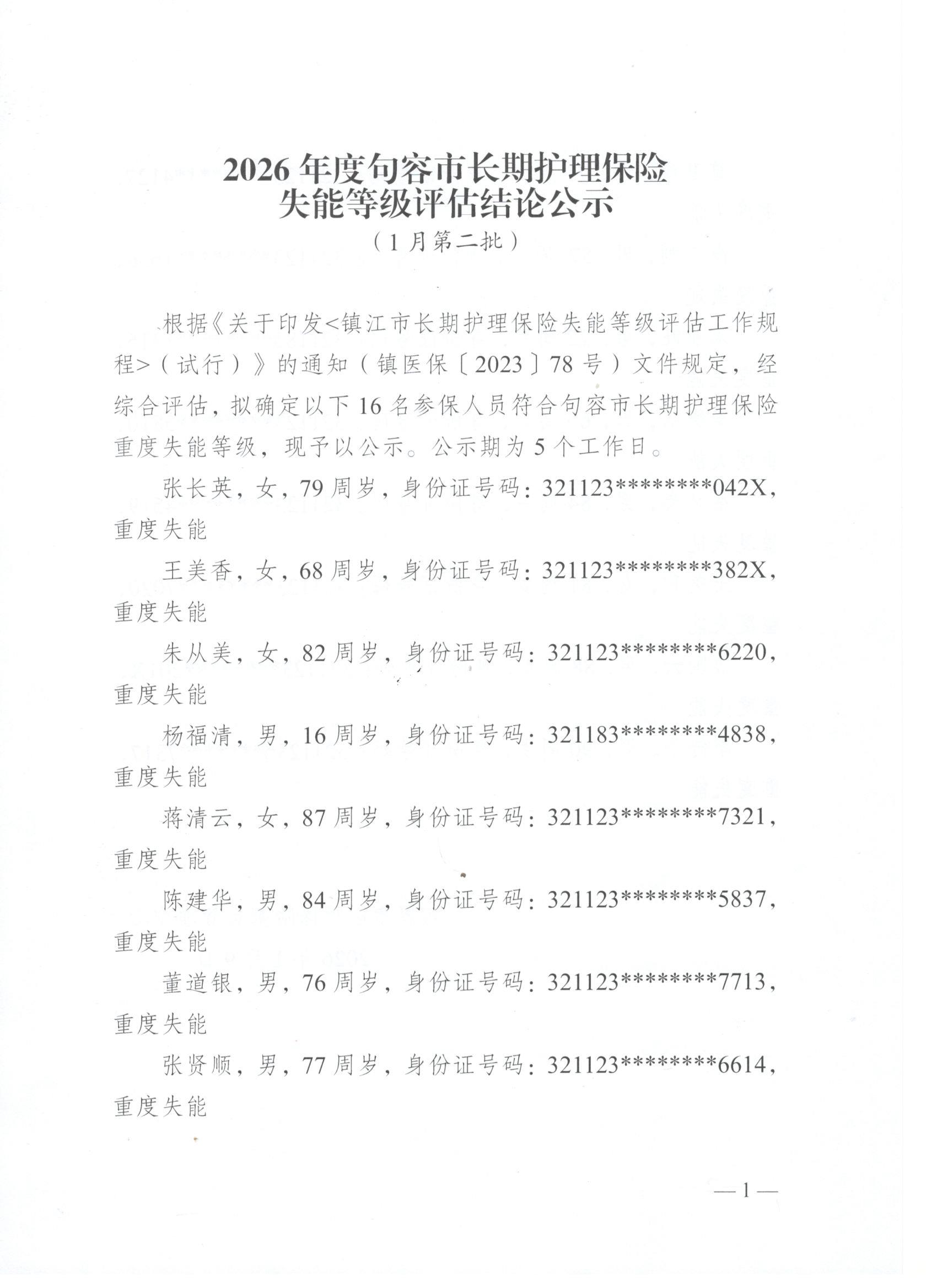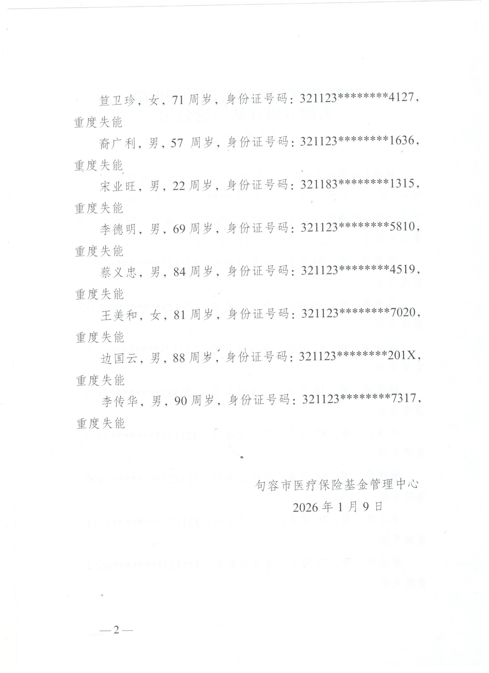 2026年度句容市长期护理保险失能等级评估结论公示(1月第二批)