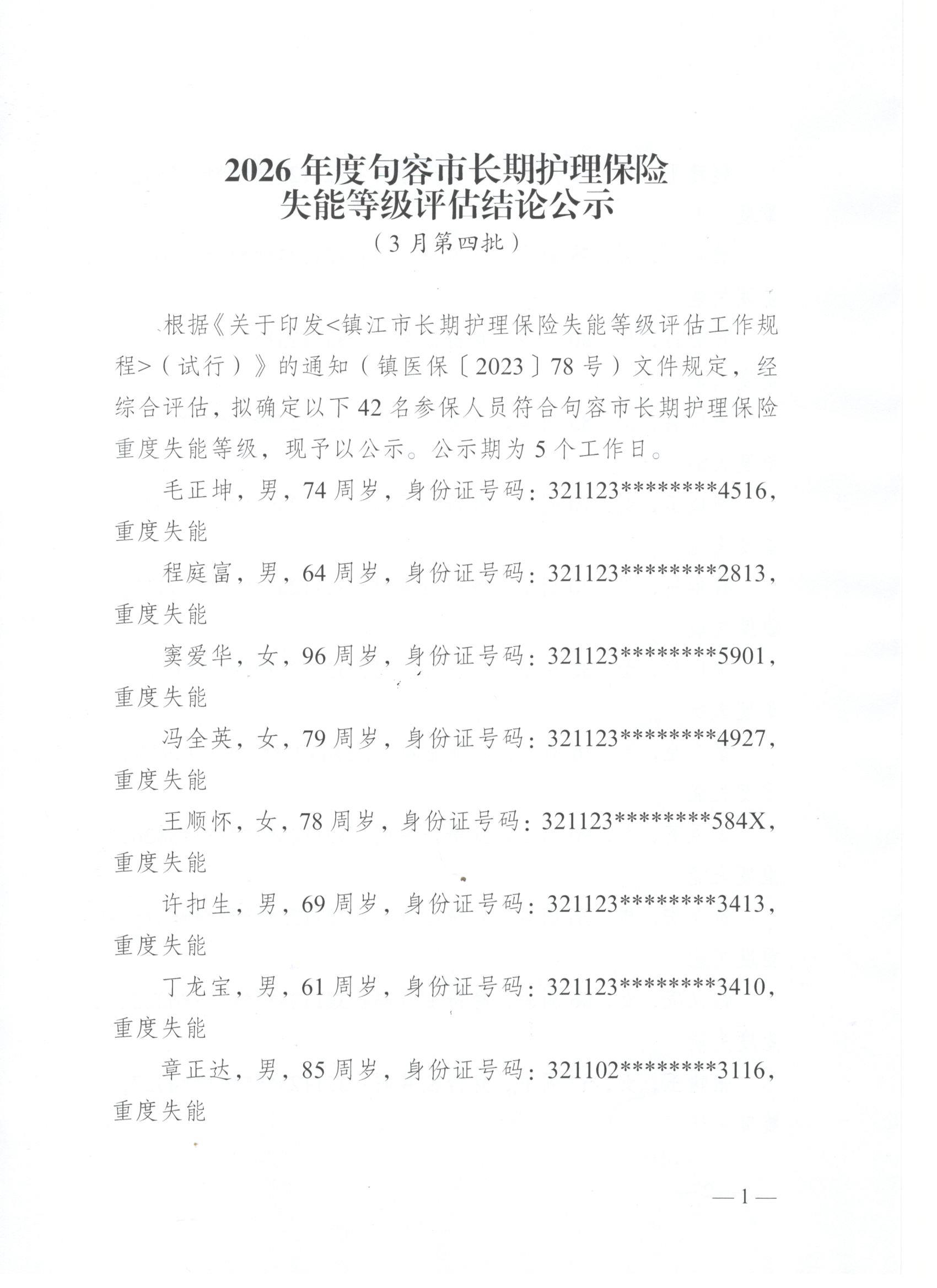 2026年度句容市长期护理保险失能等级评估结论公示(3月第四批)
