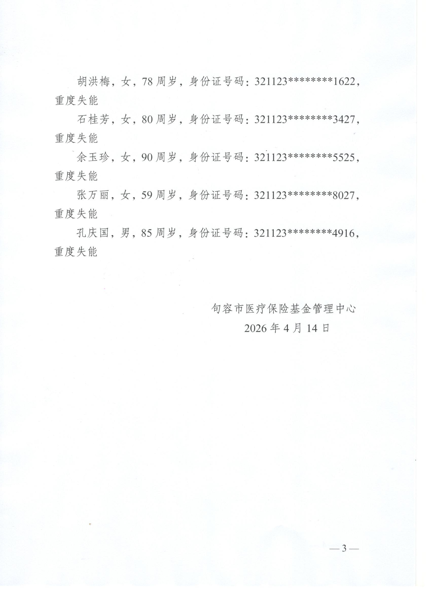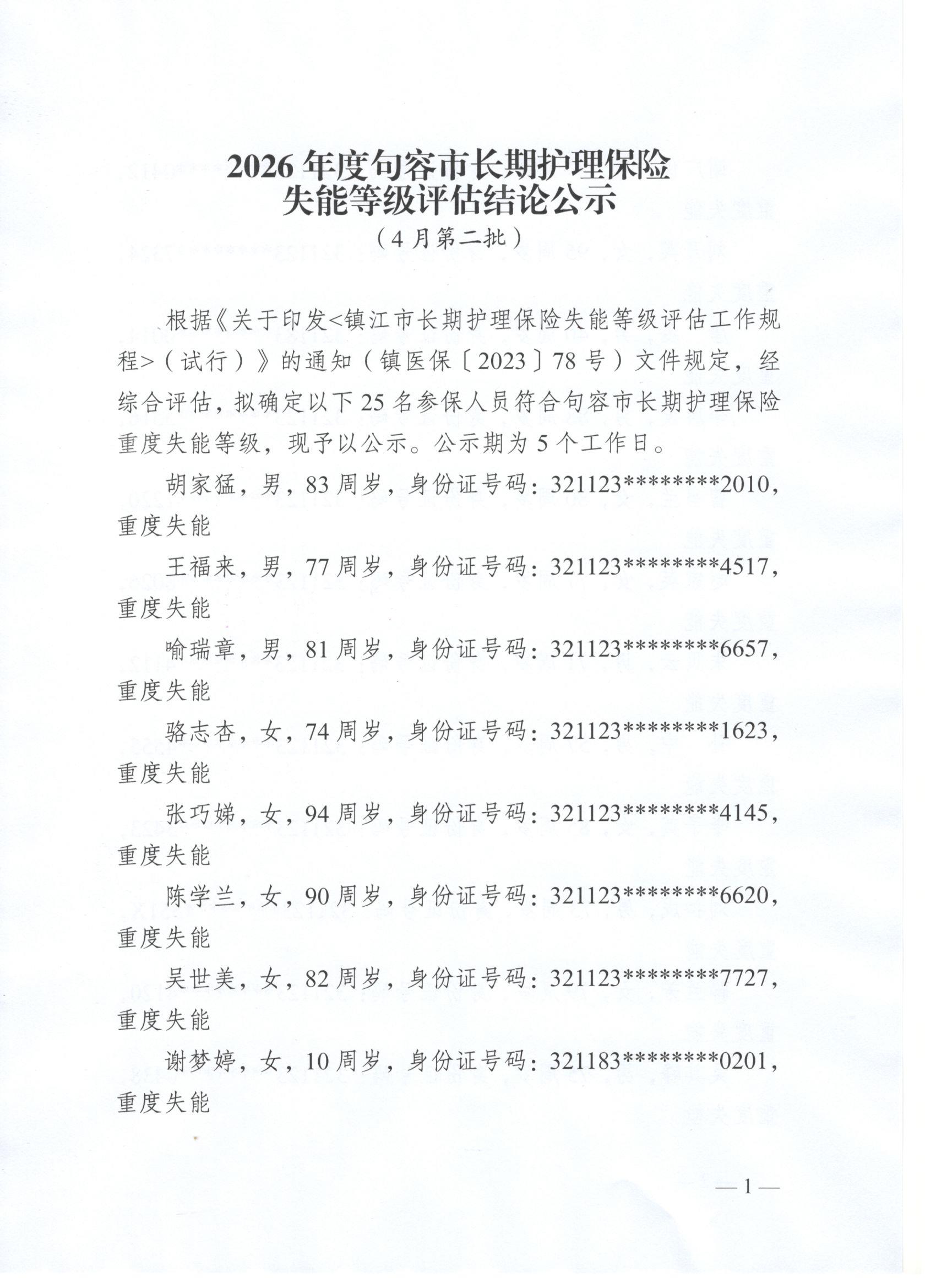 2026年度句容市长期护理保险失能等级评估结论公示(4月第二批)